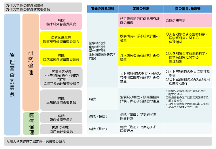 医の倫理に関する協議会 協議会規程 [2021年6月30日改正] 運営委員会内規 [2023年6月13日改正] 標準業務手順書および規程 九州大学人を対象とする生命科学・医学系研究に関する規程 [2023年5月30日改正] 倫理審査委員会(観察・介入共通)標準業務手順書 [2023年10月1日改訂] 委員会の各名称と審査の対象 九州大学(医系地区部局・病院)倫理審査委員会一覧 拡大図はこちら