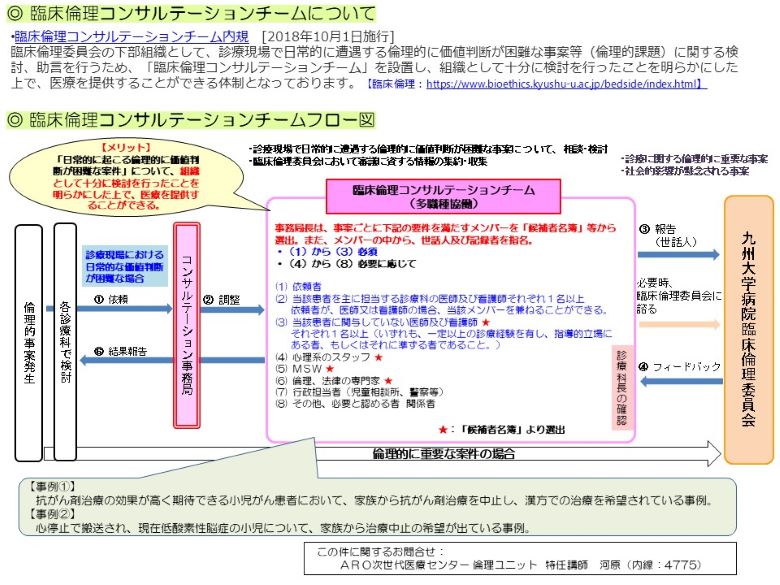臨床倫理委員会の下部組織として、診療現場で日常的に遭遇する倫理的に価値判断が困難な事案等(倫理的課題)に関する検討、助言を行うため、「臨床倫理コンサルテーションチーム」を設置し、組織として十分に検討を行ったことを明らかにした上で、医療を提供することができる体制となっております。